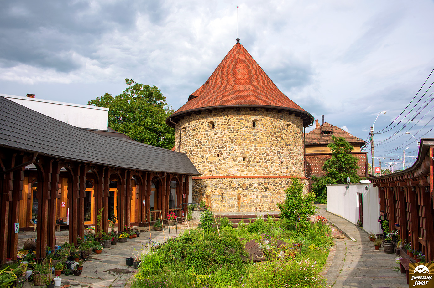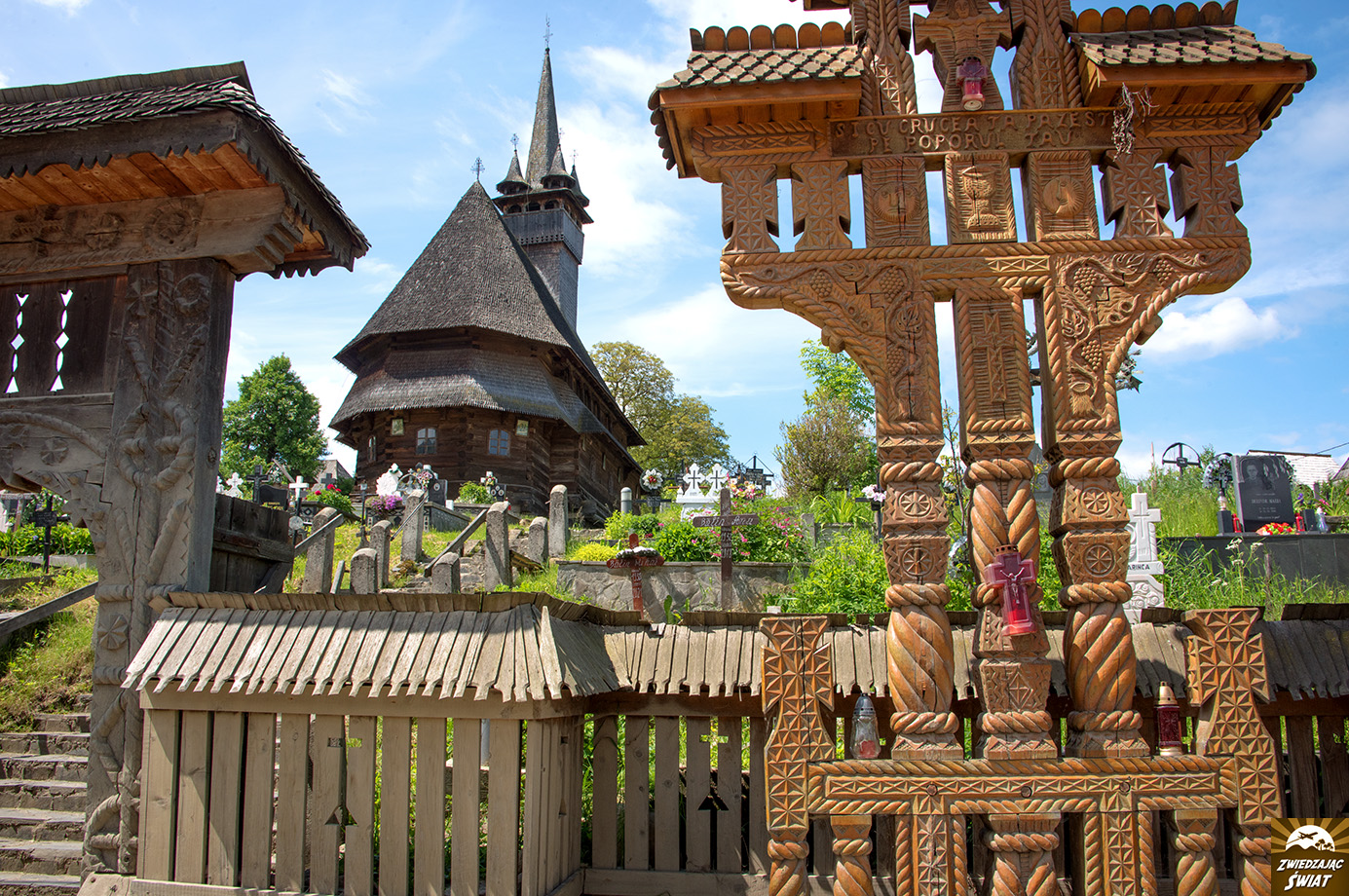 Od 1721 roku do lat 90-tych XX wieku najwyższa drewniana świątynia w Europie. Zdetronizowała ją dopiero cerkiew z Barsany, a potem z Sapanty. Wraz z ponad 50 metrową wieżą powstała bez użycia choćby jednego gwoździa. Razem z rzeźbioną bramą, ogrodzeniem i chałupkami wśród polnych kwiatów i wysokich traw tworzy sielski kompleks. Może to kwestia szczęścia, ale poza nami i opiekunką obiektu, która wpuściła nas do środka świątyni, w pobliżu nie było nikogo. W takich warunkach to doskonałe miejsce na chwilę odpoczynku. Żałowaliśmy, że nie mamy ze sobą prowiantu. Fajnie byłoby zrobić sobie tu przerwę na posiłek. Pieńki przed drewnianą chatą nadają się do tego idealnie.