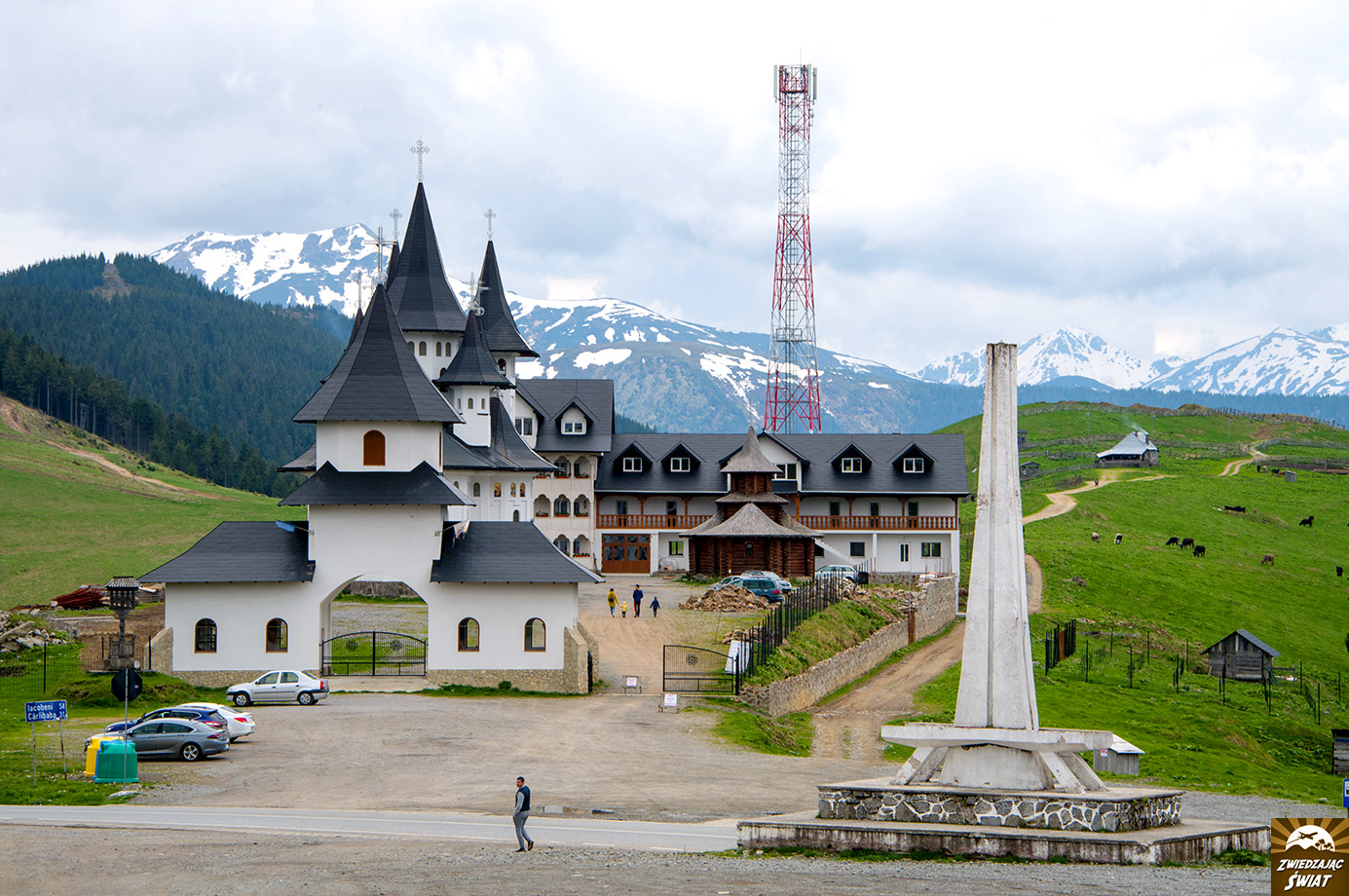 Wracając do Przełęczy Prisłop, gdy już pokonacie niekończące się serpentyny prowadzące na rozległe wypłaszczenie, rozpoznacie to miejsce po charakterystycznej zabudowie – po jednej stronie przełęczy ulokowane jest schronisko Cabana Alpina, po drugiej cerkiew i monastyr. Jest też betonowy obelisk, upamiętniający budowę asfaltowej drogi, są szałasy pasterskie, sami pasterze, ich psy i pasące się w pobliżu krowy oraz piękna panorama gór Rodniańskich i Marmaroskich.
