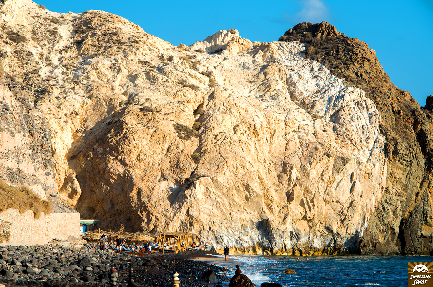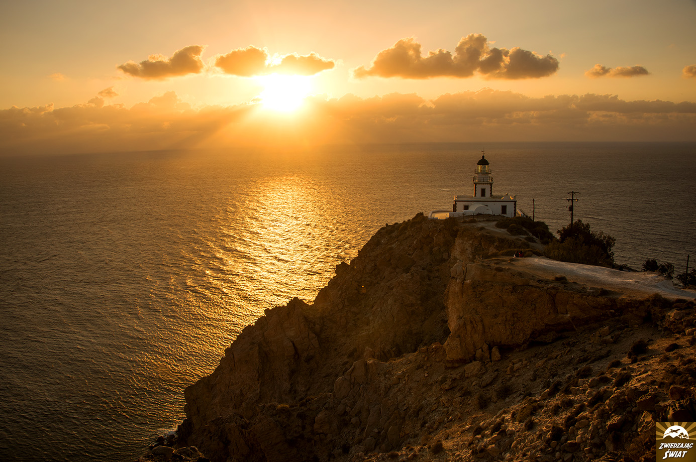 Tego dnia po powrocie z rejsu, ruszyliśmy jeszcze w stronę dwóch, położonych na południu Santorini miejsc. Pierwszym z nich była Biała Plaża z pięknymi, potężnymi skałami wokół, drugim latarnia Akrotiri – jeden z najstarszych tego typu obiektów w Grecji. Ulokowana na wysokim klifie latarnia prezentowała się wyjątkowo malowniczo na tle zachodzącego słońca. Latarnia, podobnie jak leżąca na przeciwległym końcu wyspy Oia, to doskonałe miejsce na oglądanie tego typu spektaklu.