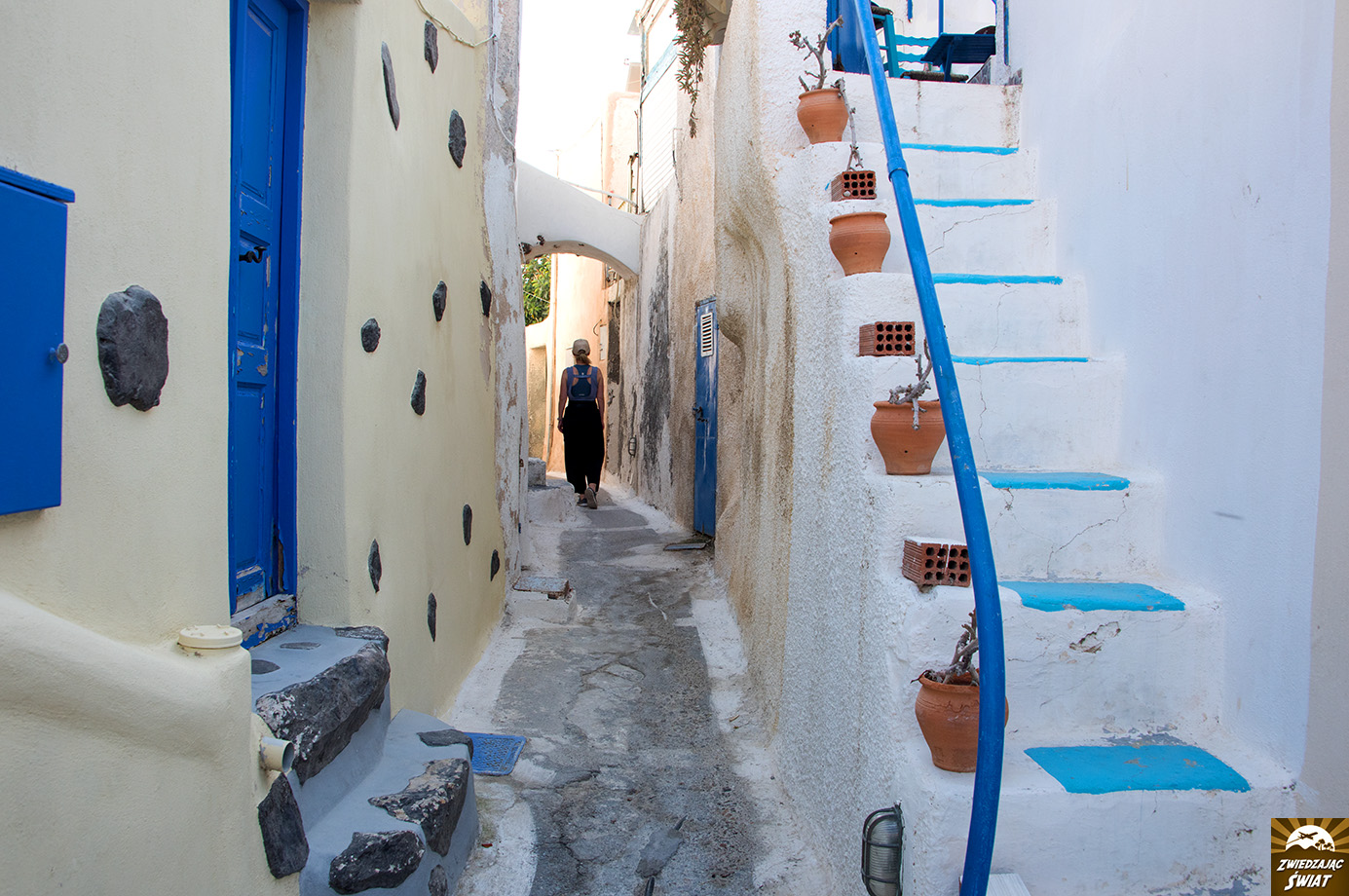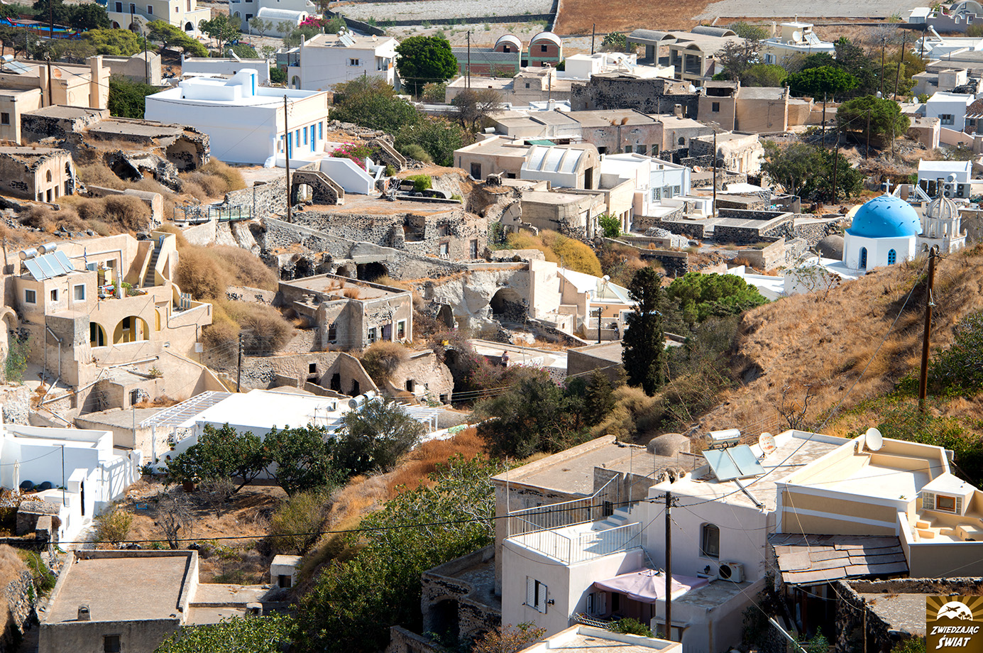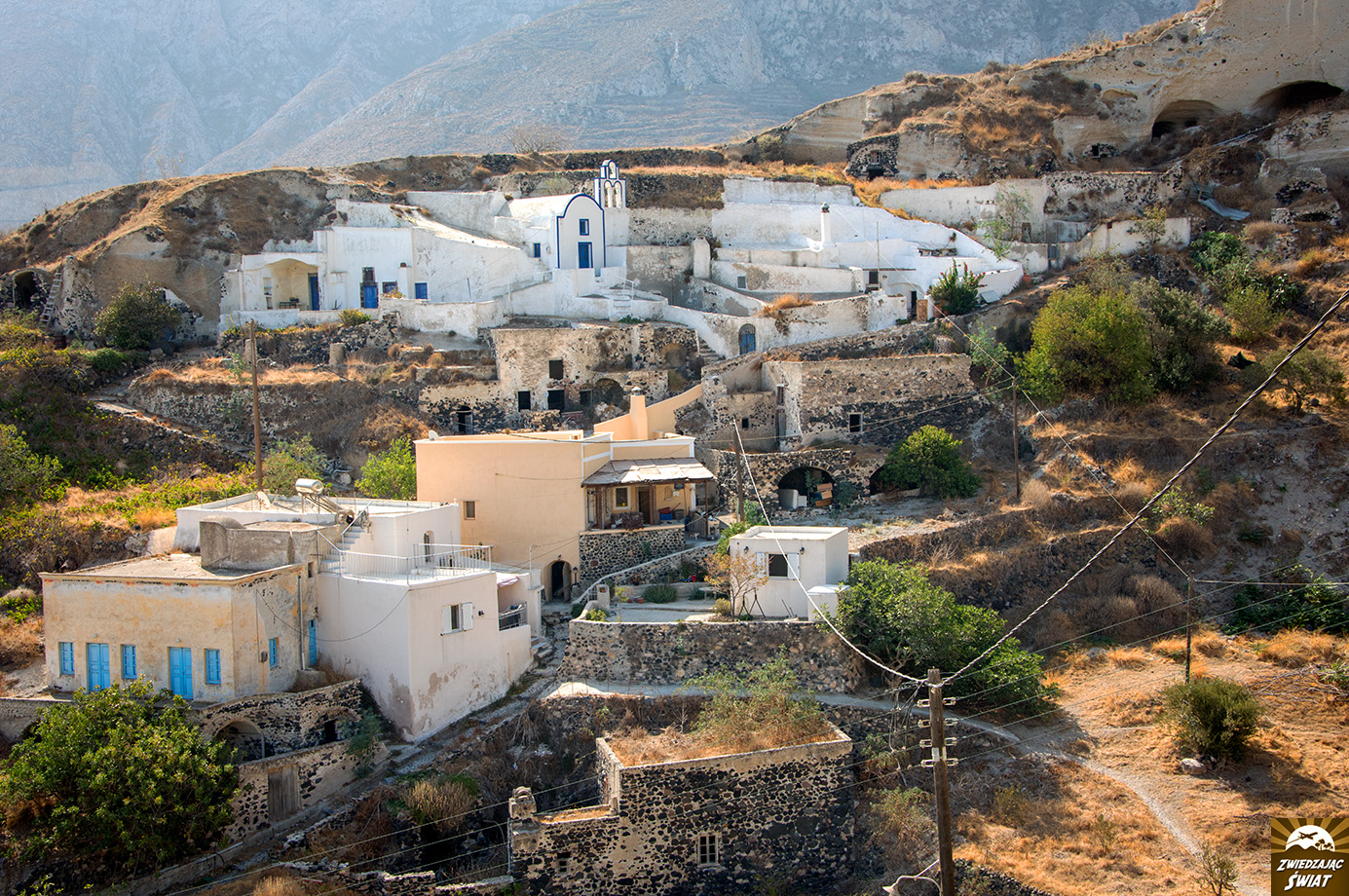 To tutaj zaczęliśmy pierwszy pełny dzień zwiedzania Santorini. Mesa Gonia zwana jest wioską duchów. Trzęsienie ziemi z 1956 roku spowodowało wiele szkód, przez co mieszkańcy osady przenieśli się do pobliskiego Kamari. Dziś miejsce nie robi już wrażenia całkowicie opuszczonego, ale nadal sporo w nim niezamieszkanych, zniszczonych domów. Z dala od tłumu turystów można tu spokojnie wędrować pustymi uliczkami wśród starych domostw i bielonych kościółków z niebieskimi kopułami.