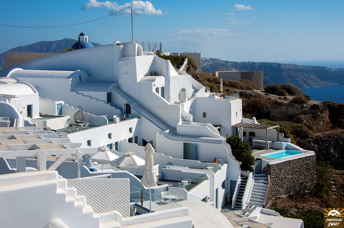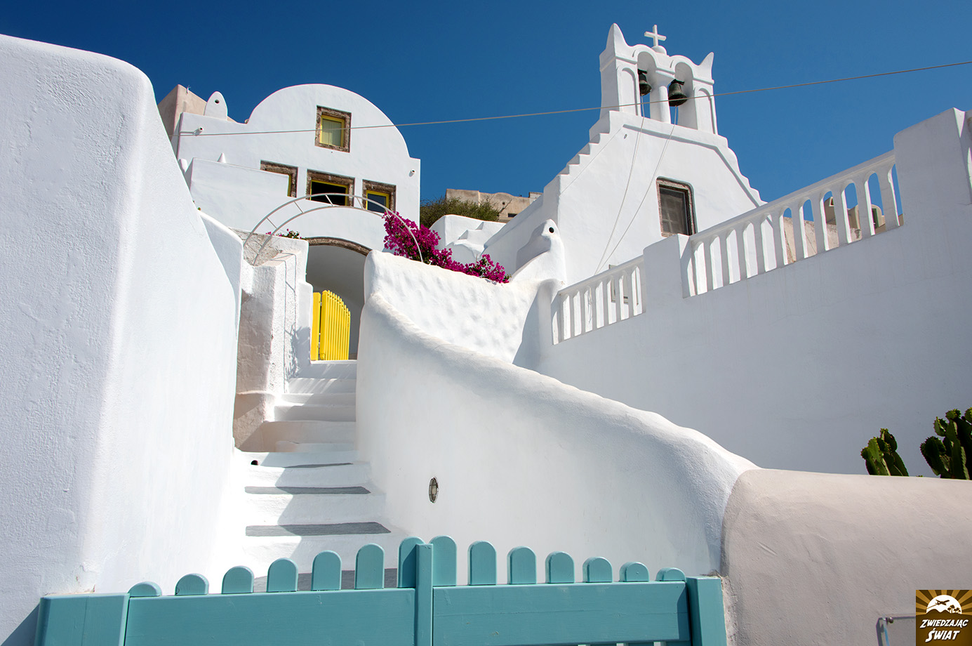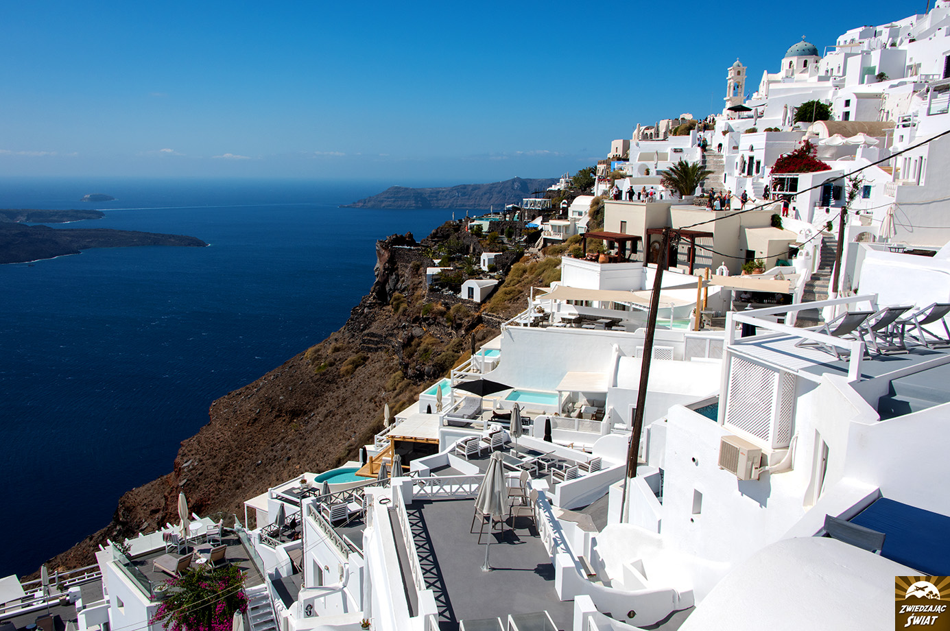 Fira – Firostefani – Imerovigli to przepiękne, białe trójmiasto. Startując na deptaku Firy i mijając po drodze luksusowe restauracje, hoteliki z basenami na tarasach, urokliwe pensjonaty i bizantyjskie kościółki, niepostrzeżenie przechodzi się z jednego miasteczka do drugiego i dalej. Spacer można zakończyć w pobliżu skały zwanej Skaros w Imerovigli, na której znajdują się pozostałości weneckiego zamku (tak właśnie zrobiliśmy, wracając później tą samą drogą do Firy) lub kontynuować go aż do Oía (tam postanowiliśmy dotrzeć na słynny zachód słońca, jednak nie pieszo a samochodem).