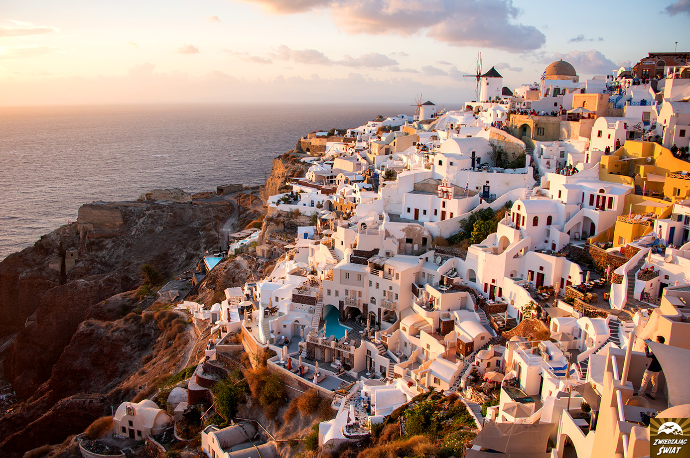 Oia uznawana jest za najbardziej malownicze miasteczko Santorini. Zachody słońca są tutaj niezapomniane. Nic więc dziwnego, że ściągają na nie tłumy turystów, nawet teraz, gdy wyspa nie jest już tak licznie odwiedzana. Najbardziej dogodnym i zarazem ogólnodostępnym miejscem do podziwiania słynnych zachodów słońca są ruiny weneckiego zamku, gdzie strategiczne miejscówki zajmowane są z dużym wyprzedzeniem. W tym czasie zapełniają się również tarasy restauracji, z których można oglądać zachód słońca, i te przed hotelikami i pensjonatami wynajmowanymi za okrągłe sumki. W Oia widać, że miasteczko nastawione jest na zamożnych turystów – świadczą o tym drogie butiki, sklepy i restauracje, ciągnące się wzdłuż lśniących marmurowych trotuarów. Trzeba jednak przyznać, że zabudowa miasteczka, która nie jest ortodoksyjnie biała, lecz kolorowa, prezentuje się bajecznie w świetle zachodzącego słońca.