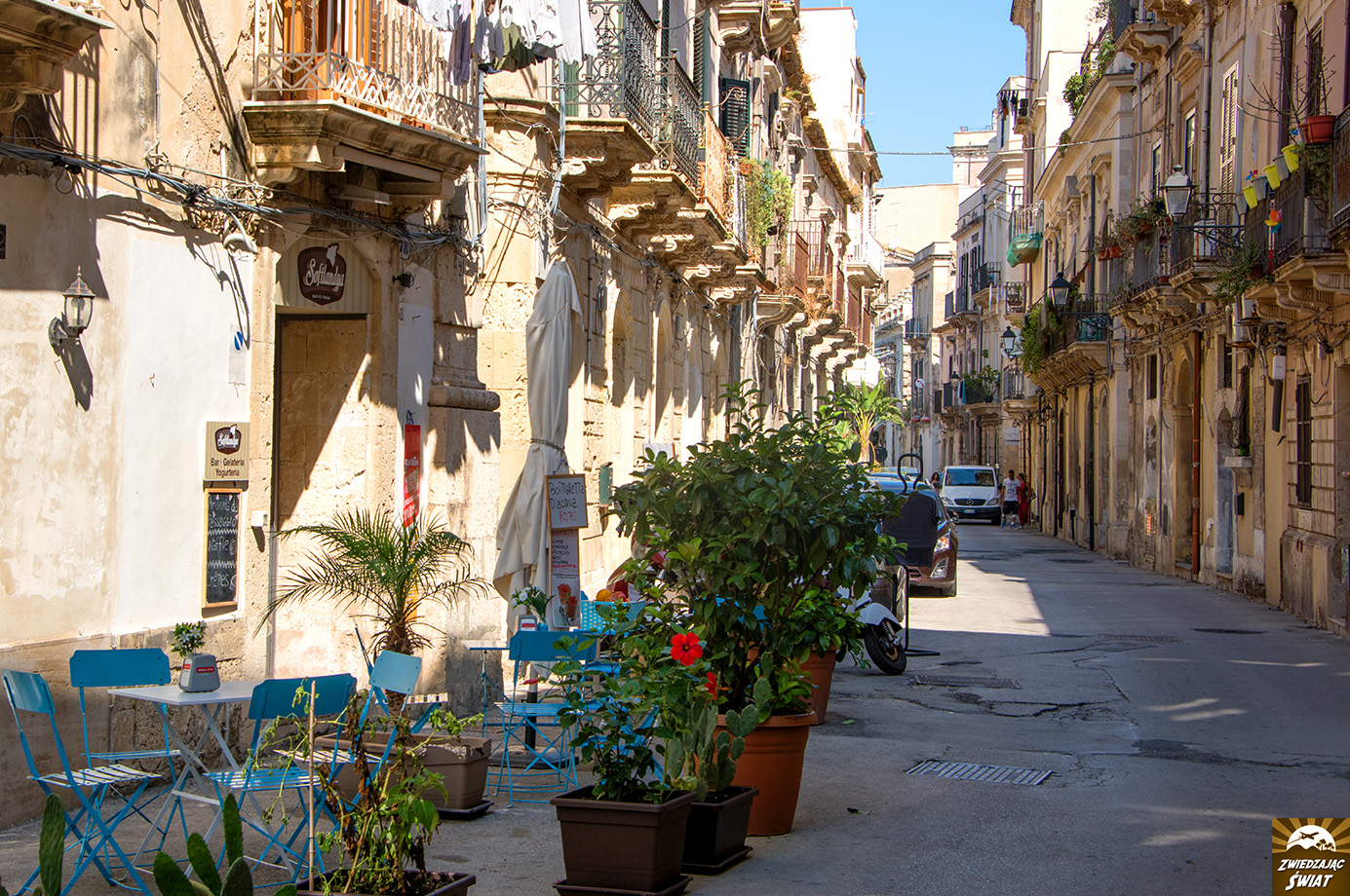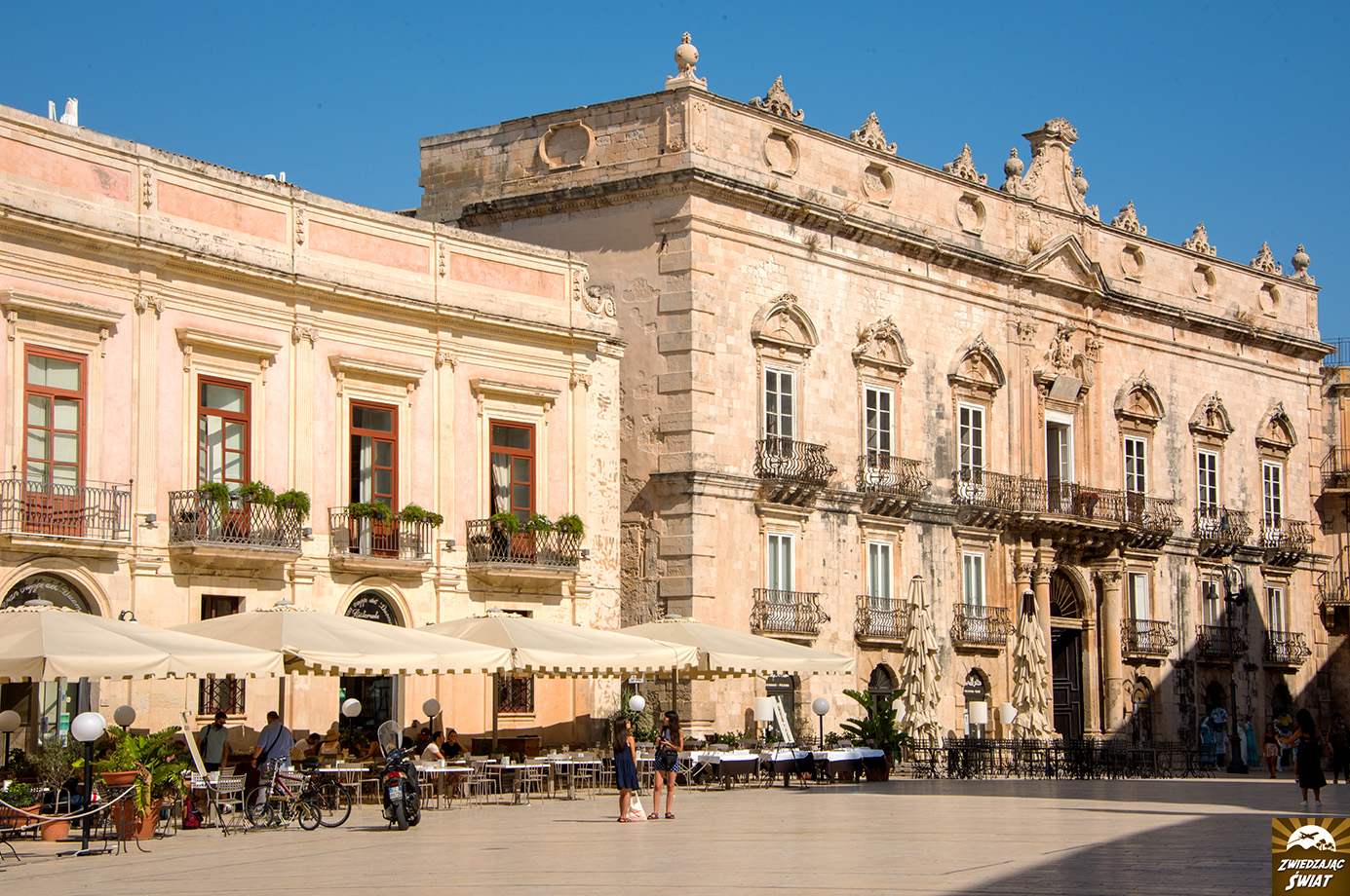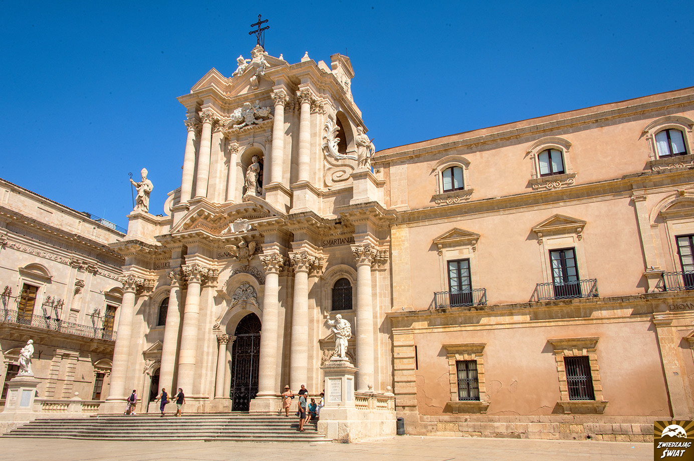 Dla nas Syrakuzy to przede wszystkim wyspa Ortygia (wł. Isola di Ortigia). Wyspę z lądem łączy wąski przesmyk i dwa mosty – Ponte Umbertino oraz Ponte Santa Lucia. Ortygia to najstarsza część Syrakuz z przepięknym Piazza del Duomo, którego ozdobą jest katedra Santa Maria delle Colonne. Katedra powstała na pozostałościach antycznej świątyni Ateny, a w jej wnętrzu nadal można podziwiać piękne doryckie kolumny. Piazza del Duomo przed katedrą to rozległy plac otoczony jasnymi barokowymi fasadami świątyń i pałaców, z kilkoma restauracjami, których stoliki skrywa cień chroniących przed ostrym słońcem parasoli.