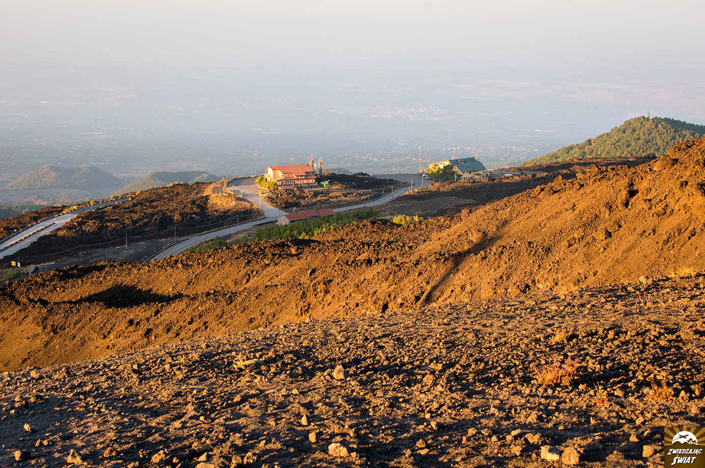 W środku nocy opuszczamy nasze mieszkanko w Katanii. Przejazd, wypożyczonym na czas podróży po wyspie autem, zajmuje nam godzinę. Bladym świtem docieramy na pusty o tej porze, rozległy parking przed Rifugio Sapienza. Schronisko Sapienza znajduje się na wysokości 1910 m n.p.m. Przy nim ulokowana jest dolna stacja kolejki wywożącej turystów na ok. 2500 m n.p.m. Gdy ruszamy na szlak, wschodzące słońce podświetla na pomarańczowo wydobywające się z krateru opary. Chwilę wcześniej, kiedy wokół panowały jeszcze ciemności, podziwialiśmy rozpalony do czerwoności wierzchołek Etny na tle nocnego nieba. Widok był niesamowity!