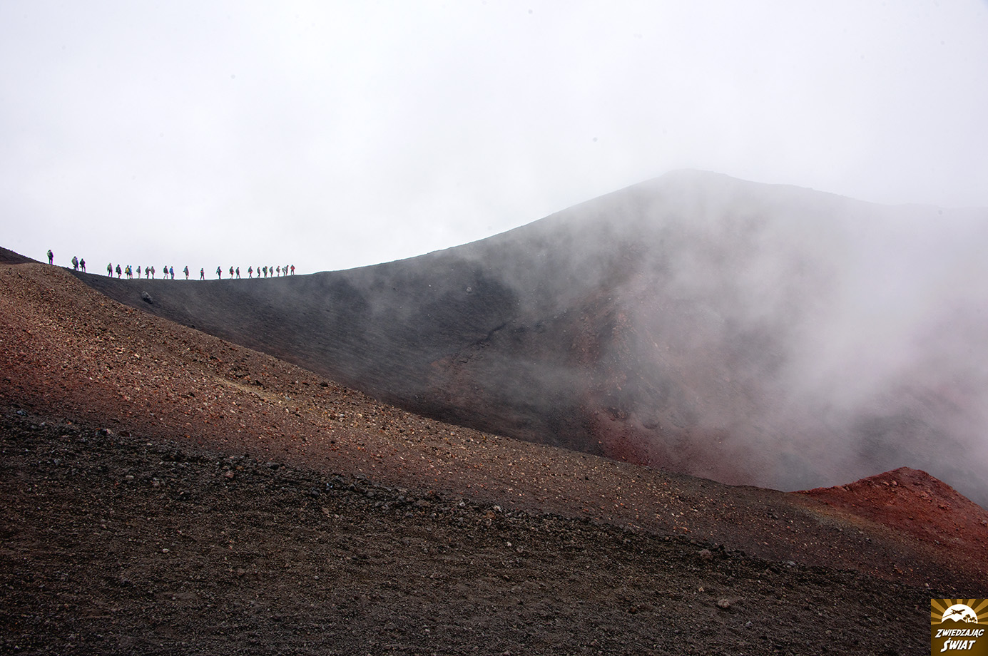 Wędrówka brzegiem krateru, momentami bardzo wąskim i przepaścistym, z odsłaniającymi się i chwilę później znikającymi we mgle widokami, jest niesamowitym przeżyciem. Na własnej skórze doświadczamy, jak zmienne warunki panują w tym miejscu. I jak bardzo przydają się tutaj ciepłe ubrania i odpowiednie buty.