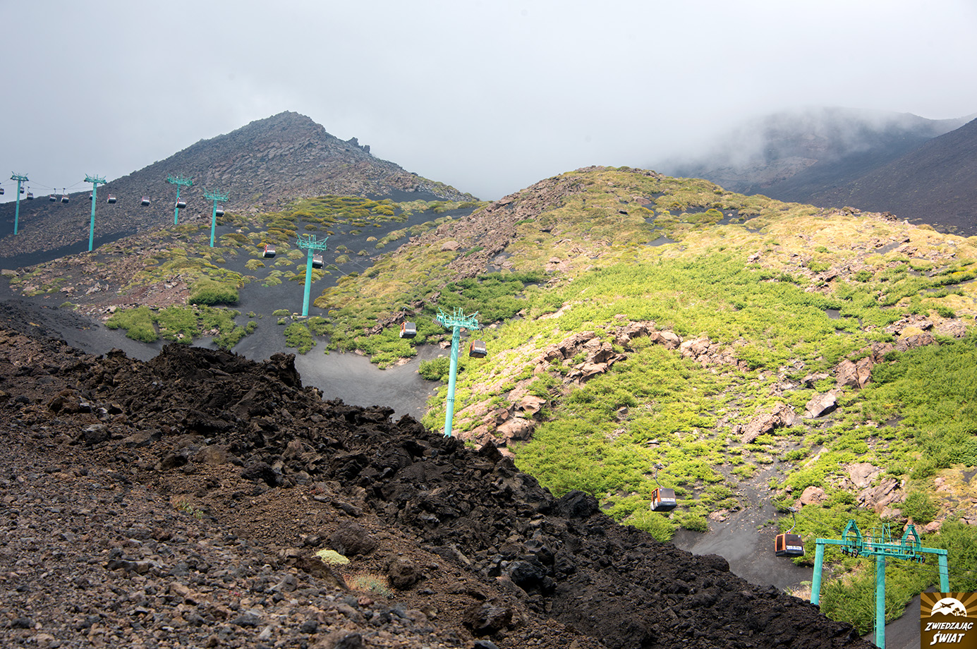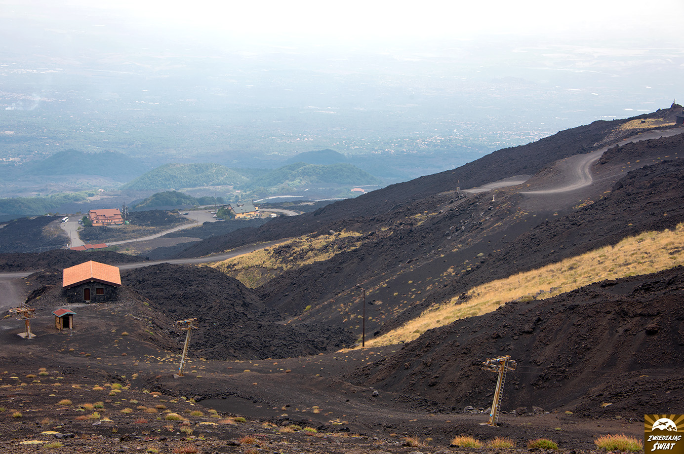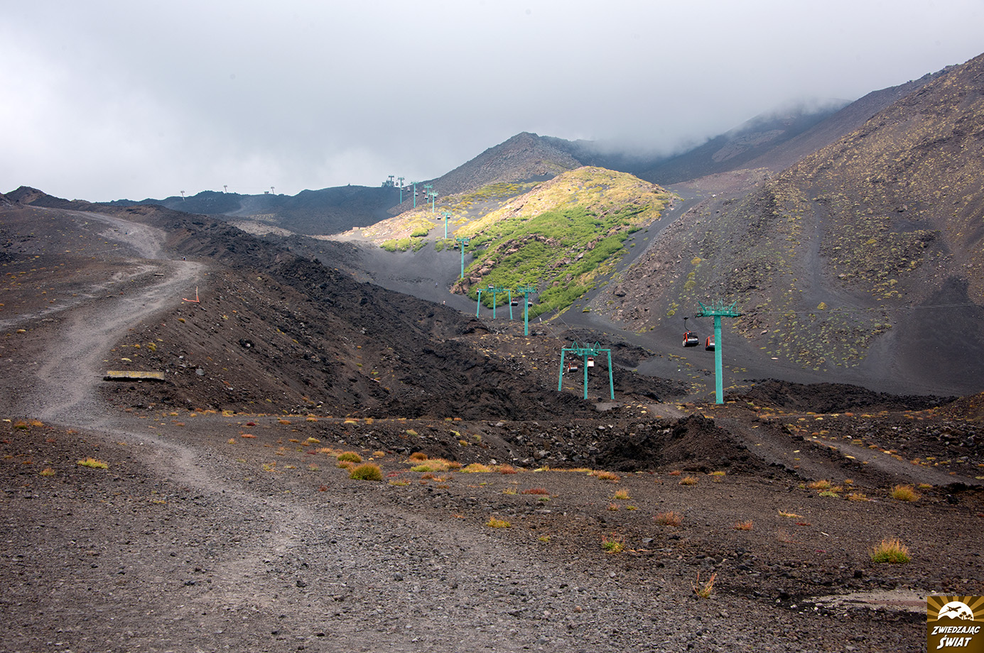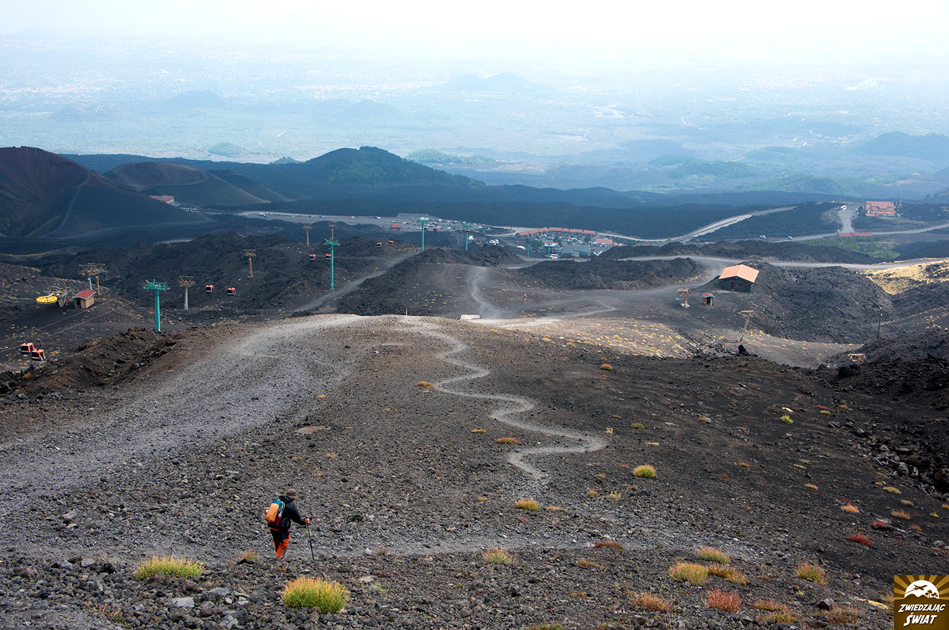 Z Rifugio Sapienza rozpoczynamy podejście w stronę górnej stacji kolejki. Unoszony przez wiatr popiół wpada do oczu, i nawet okulary przeciwsłoneczne nie są przed nim wystarczającą ochroną. Żwirowe podłoże co krok ucieka spod stóp.