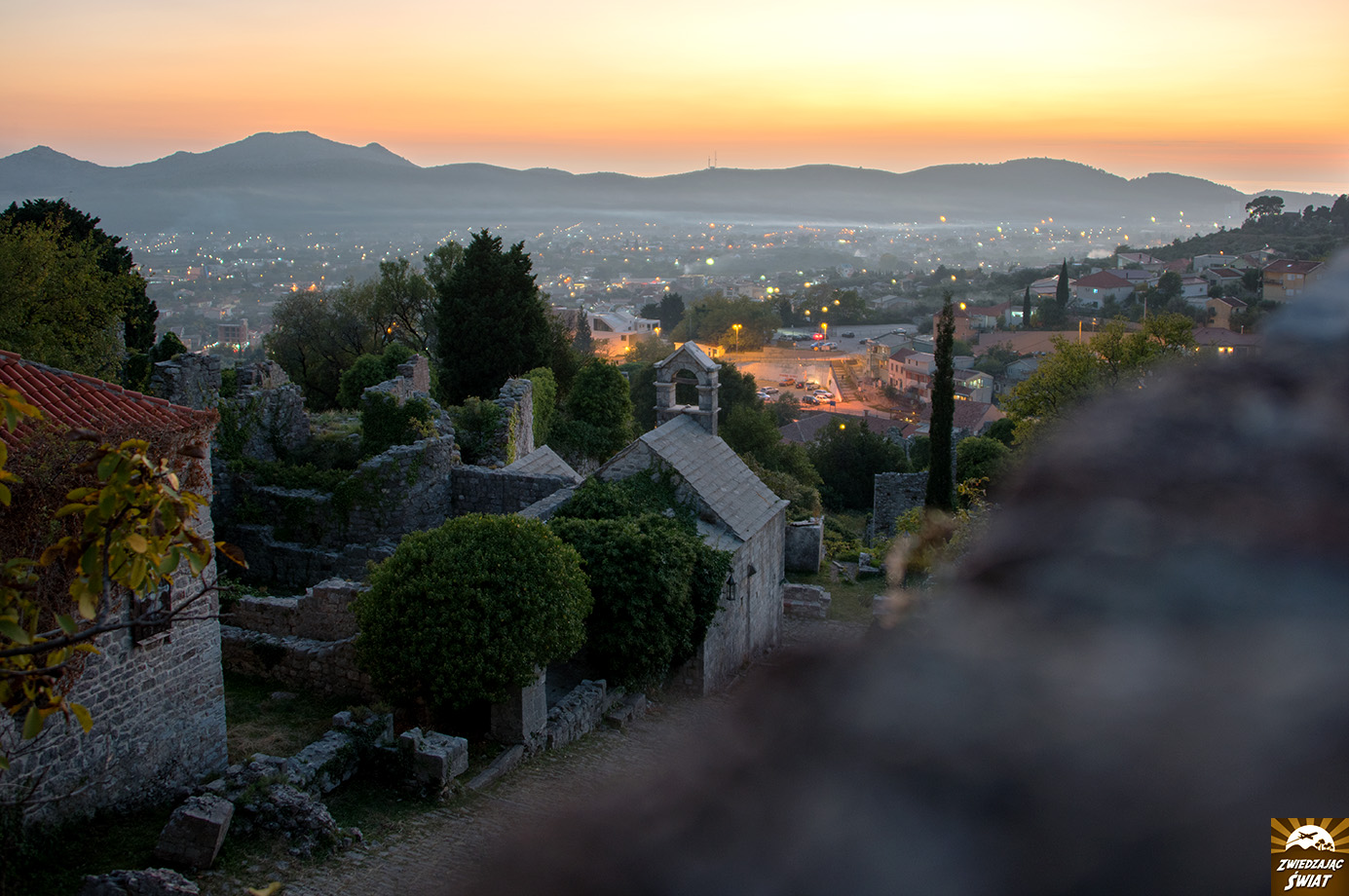 Pięknie prezentuje się na ich tle wieża kościoła św. Jana Chrzciciela. Widać stąd również cerkiew Trójcy Świętej oraz kościół Santa Maria in Punta – najstarszy budynek w mieście, a także wyspę Sveti Nikola.